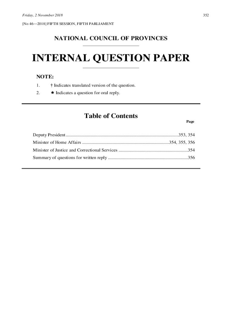 Friday, 2 November 2018352[No 462018] FIFTH SESSION, FIFTH PARLIAMENTNATIONAL COUNCIL OF PROVINCES ___INTERNAL QUESTION PAPER ___NOTE: 1. Indicates translated version of the question.2. Indicates