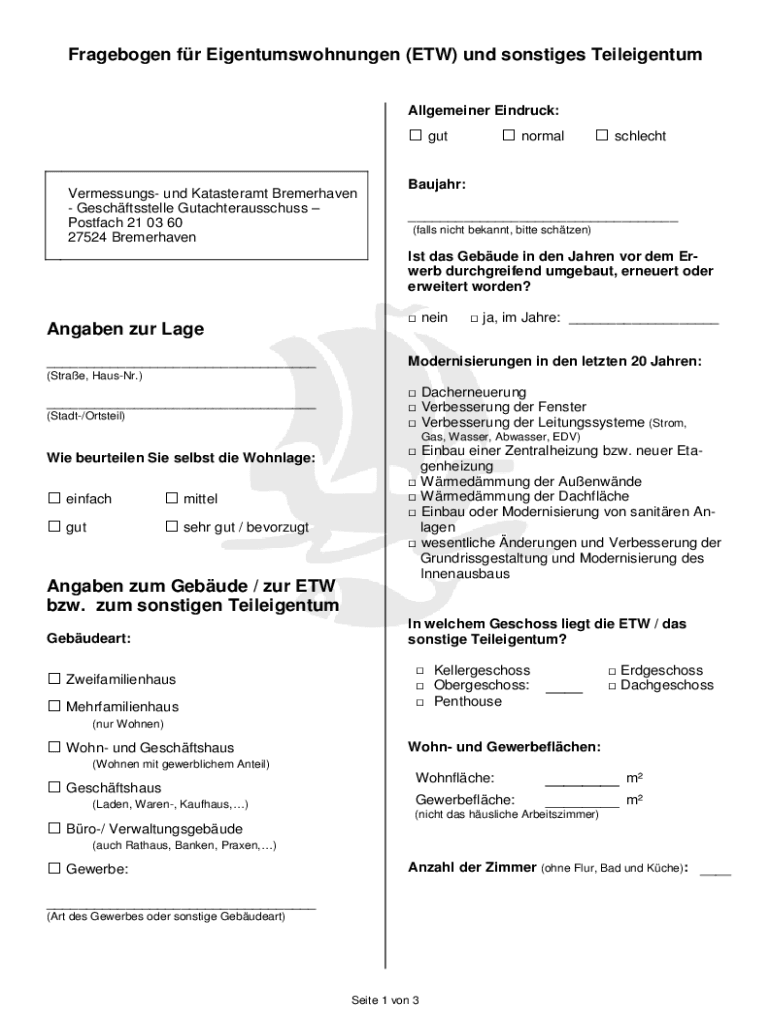 Fragebogen fr Eigentumswohnungen (ETW) und sonstiges Teileigentum Allgemeiner Eindruck: gut Vermessungs und Katasteramt Bremerhaven Geschftsstelle Gutachterausschuss Postfach 21 03 60 27524 BremerhavenFormular