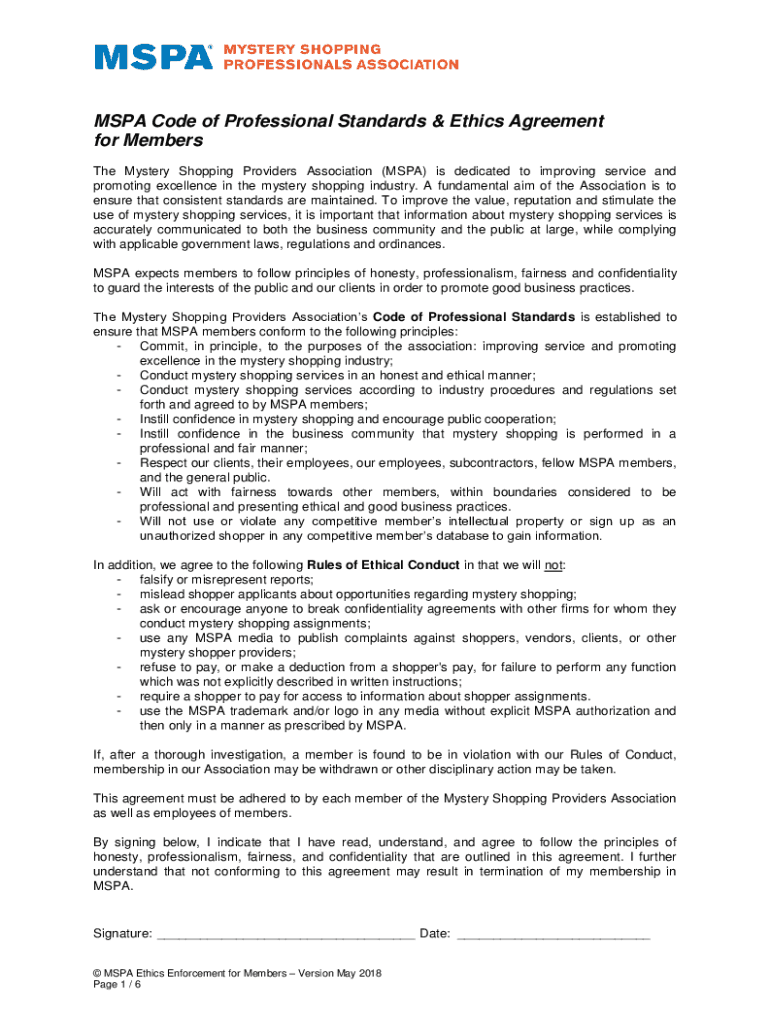 MSPA Code of Professional Standards & Ethics Agreement for Members The Mystery Shopping Providers Association (MSPA) is dedicated to improving service and promoting excellence in the mystery shopping