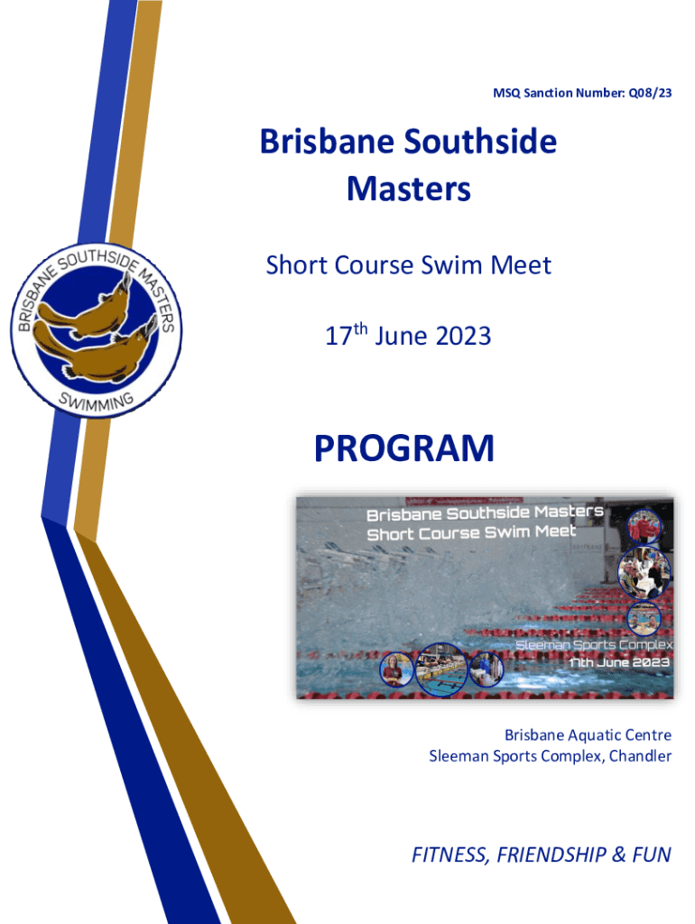 MSQ Sanction Number: Q08/23Brisbane Southside Masters Short Course Swim Meet 17th June 2023PROGRAMBrisbane Aquatic Centre Sleeman Sports Complex, ChandlerFITNESS, FRIENDSHIP & FUNWelcome Welcome and
