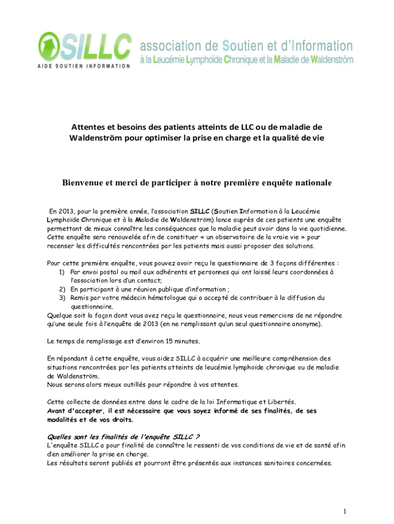 Attentes et besoins des patients atteints de LLC ou de maladie de Waldenstrm pour optimiser la prise en charge et la qualit de vieBienvenue et merci de participer notre premire enqute nationale En