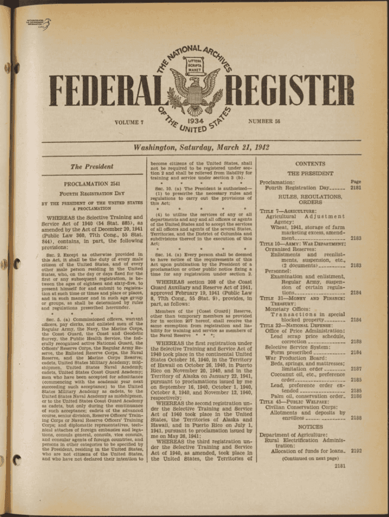 FEDERAL c ^AMTED 1934 y ^VOLUME 7REGISTER NUMBER 56Washington, Saturday, March 21, 1942 The President PROCLAMATION 2541 F ourth R egistration D ay BY THE PRESIDENT OF THE UNITED STATES A PROCLAMATIONWHEREAS