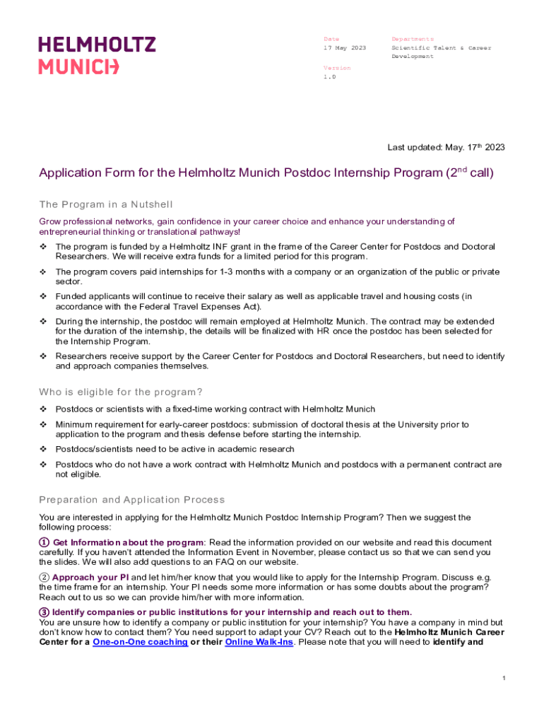 Date 17 May 2023Departments Scientific Talent & Career DevelopmentVersion 1.0Last updated: May. 17th 2023Application Form for the Helmholtz Munich Postdoc Internship Program (2nd call) The Program