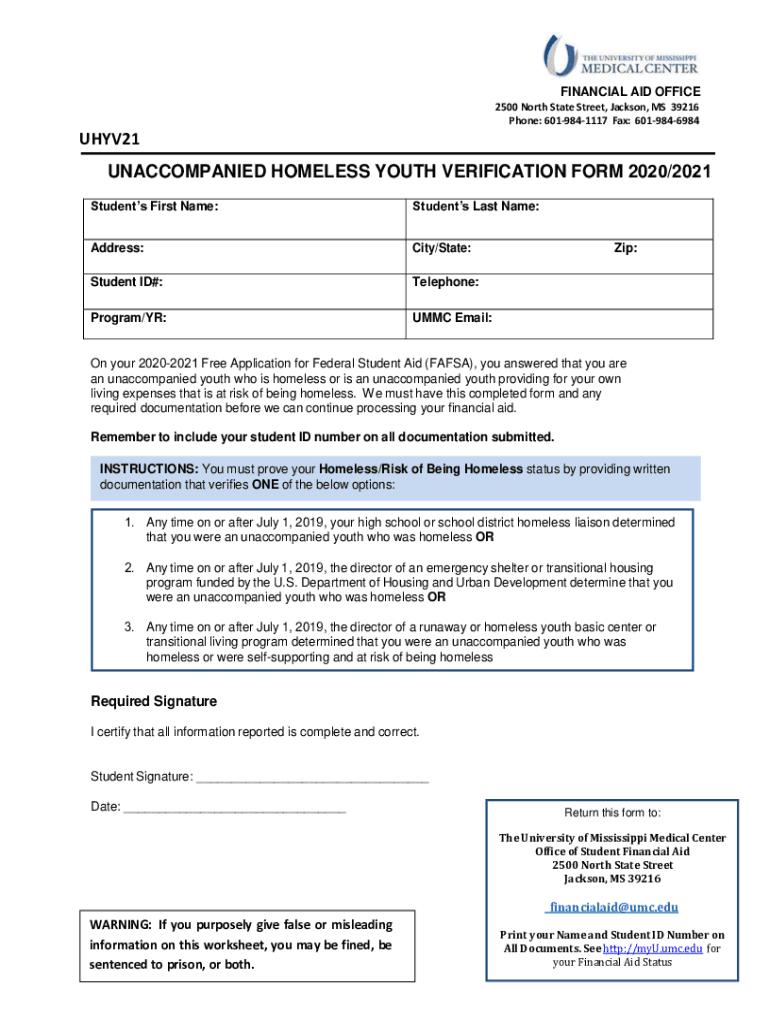 FINANCIAL AID OFFICE 2500 North State Street, Jackson, MS 39216 Phone: 6019841117 Fax: 6019846984UHYV21 UNACCOMPANIED HOMELESS YOUTH VERIFICATION FORM 2020/2021 Students First Name:Students Last Name:Address:City/State:Student
