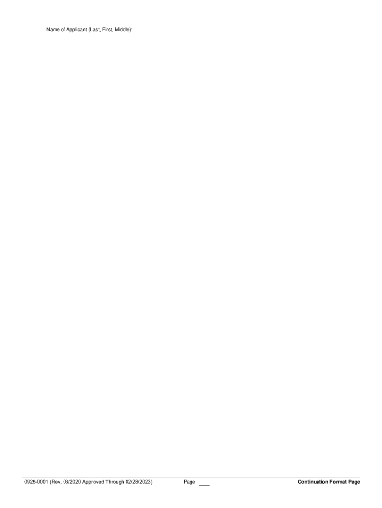 Click for More Info on This FormName of Applicant (Last, First, Middle):09250001 (Rev. 03/2020 Approved Through 02/28/2023)PageContinuation Format Page