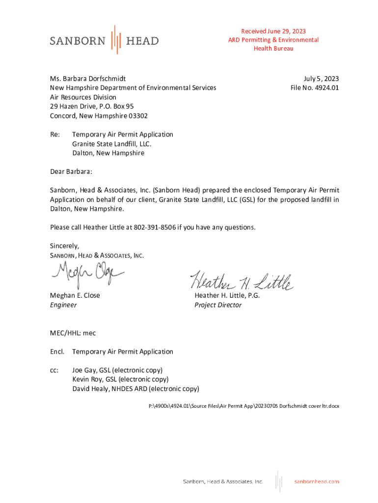 Received June 29, 2023 ARD Permitting & Environmental Health BureauMs. Barbara Dorfschmidt New Hampshire Department of Environmental Services Air Resources Division 29 Hazen Drive, P.O. Box 95 Concord,