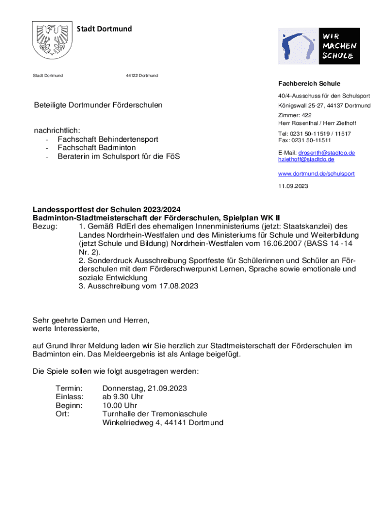 Stadt Dortmund44122 DortmundFachbereich Schule 40/4Ausschuss fr den SchulsportBeteiligte Dortmunder FrderschulenKnigswall 2527, 44137 Dortmund Zimmer: 422 Herr Rosenthal / Herr Ziethoffnachrichtlich: