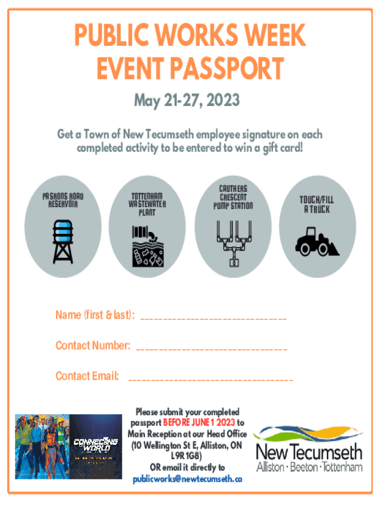 PUBLIC WORKS WEEK EVENT PASSPORT May 2127, 2023 Get a Town of New Tecumseth employee signature on each completed activity to be entered to win a gift card!PASRONS ROAD RESERVOIRTOTTENHAM WASTEWATER