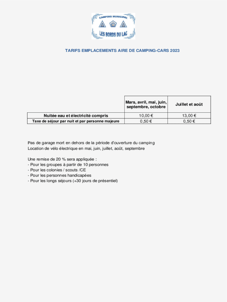 TARIFS EMPLACEMENTS AIRE DE CAMPINGCARS 2023Nuite eau et lectricit compris Taxe de sjour par nuit et par personne majeureMars, avril, mai, juin, septembre, octobreJuillet et aot10,00 0,50 13,00 0,50