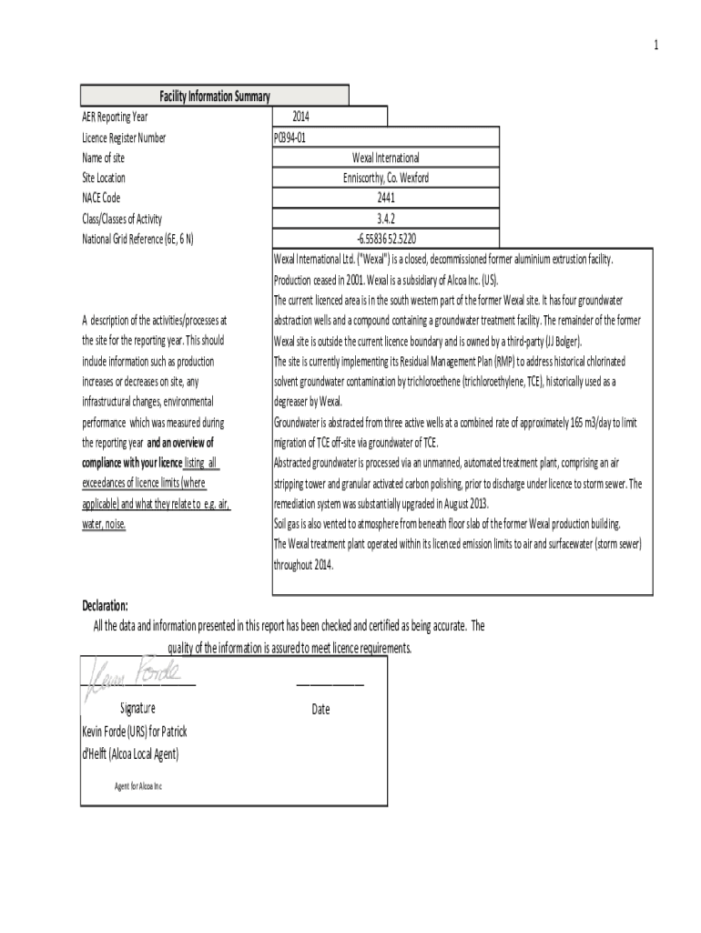 1Facility Information Summary AER Reporting Year Licence Register Number Name of site Site Location NACE Code Class/Classes of Activity National Grid Reference (6E, 6 N)A description of the activities/processes
