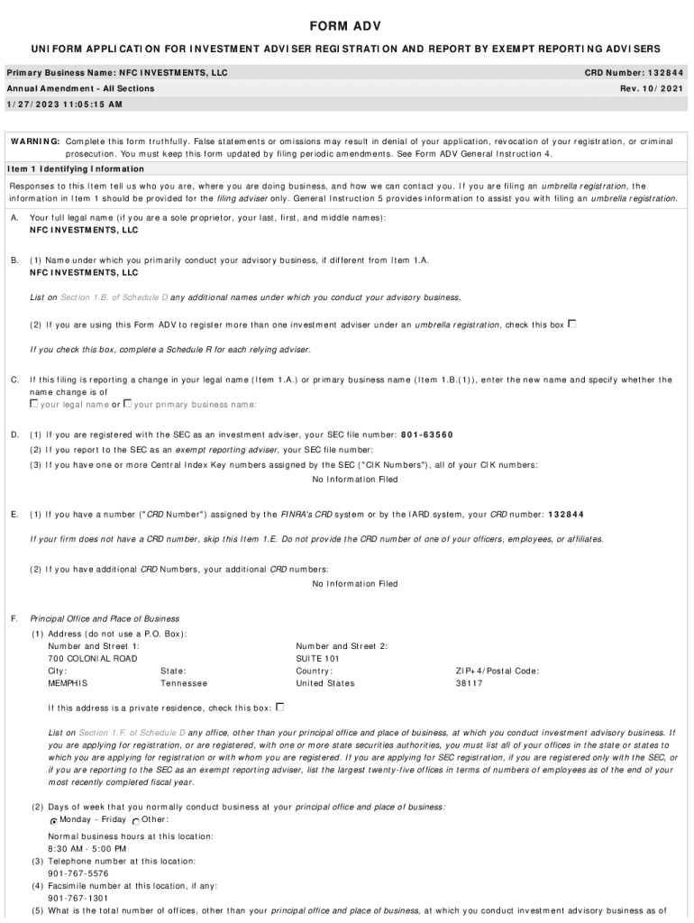 FORM ADV UNIFORM APPLICATION FOR INVESTMENT ADVISER REGISTRATION AND REPORT BY EXEMPT REPORTING ADVISERS Primary Business Name: NFC INVESTMENTS, LLCCRD Number: 132844Annual Amendment All SectionsRev.