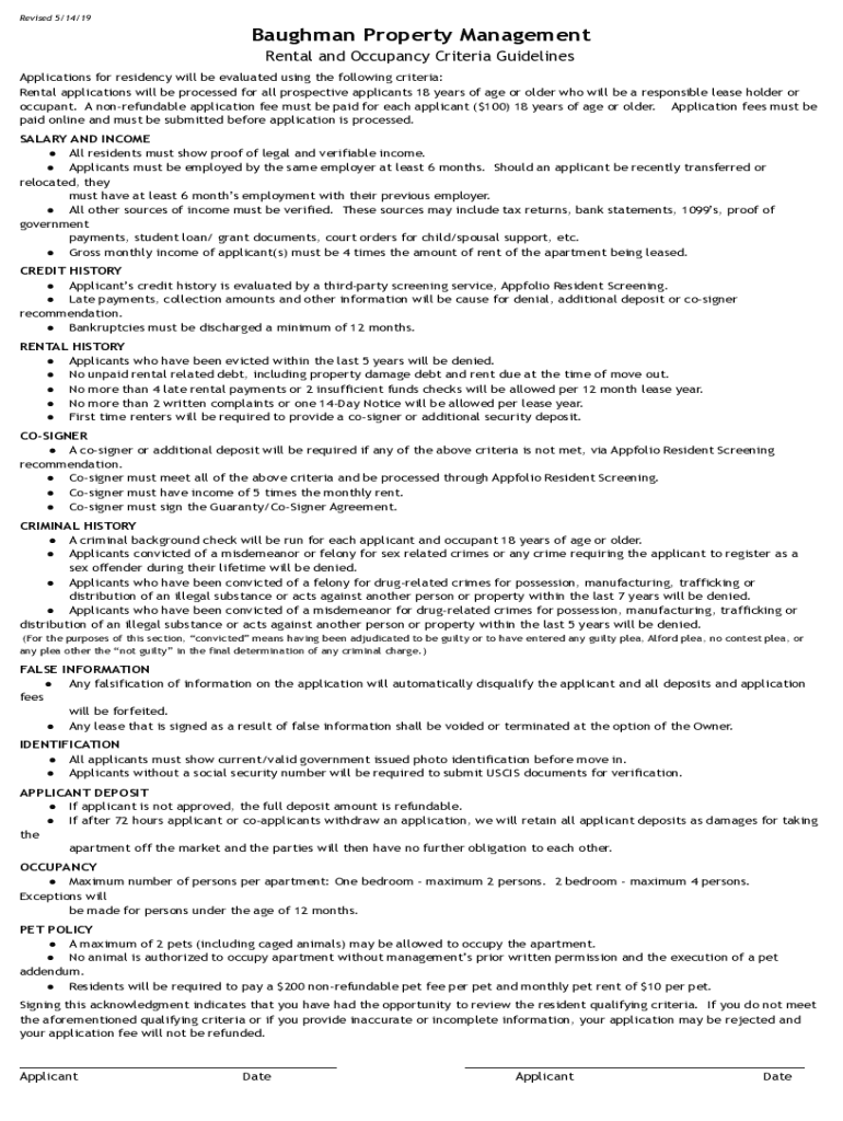 Revised 5/14/19Baughman Property Management Rental and Occupancy Criteria Guidelines Applications for residency will be evaluated using the following criteria: Rental applications will be processed
