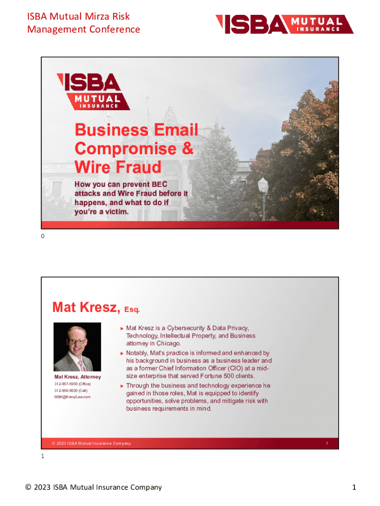 ISBAMutualMirzaRisk ManagementConferenceBusiness Email Compromise & Wire Fraud How you can prevent BEC attacks and Wire Fraud before it happens, and what to do if youre a victim. 0Mat Kresz, Esq.