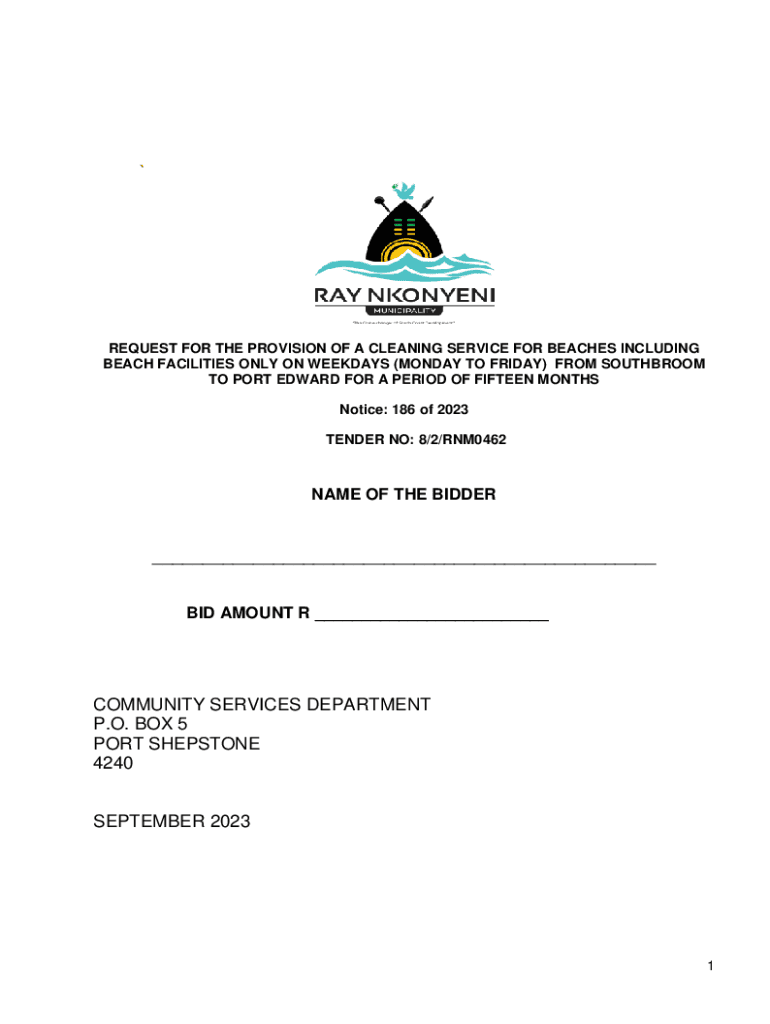 `REQUEST FOR THE PROVISION OF A CLEANING SERVICE FOR BEACHES INCLUDING BEACH FACILITIES ONLY ON WEEKDAYS (MONDAY TO FRIDAY) FROM SOUTHBROOM TO PORT EDWARD FOR A PERIOD OF FIFTEEN MONTHS Notice: 186