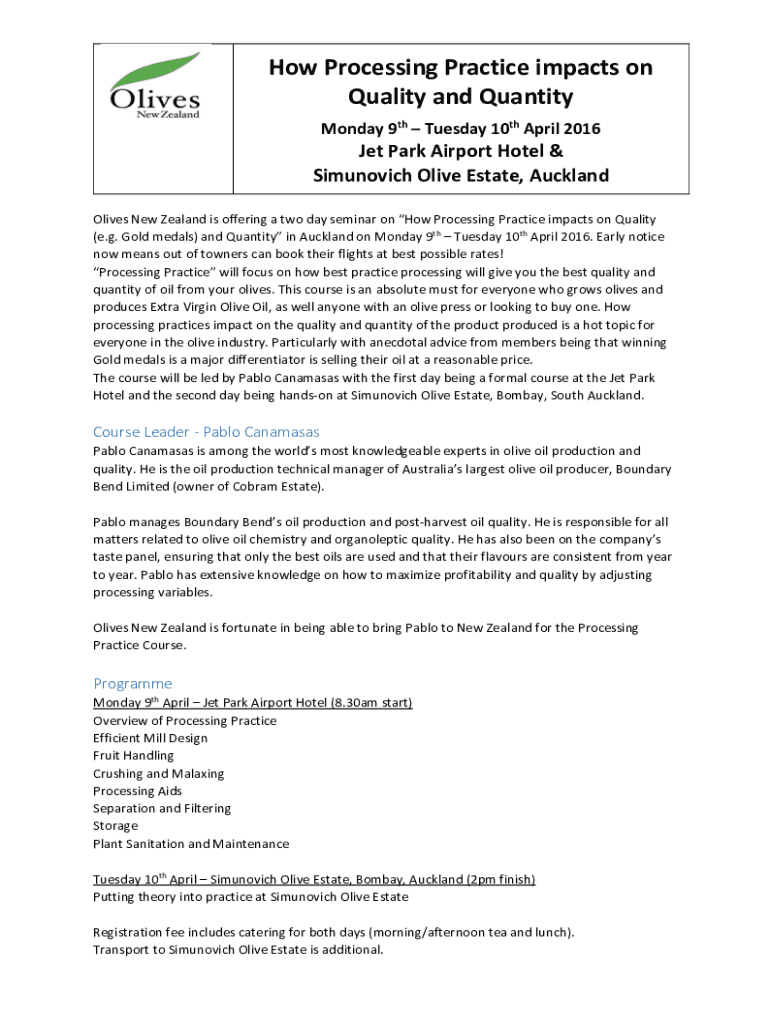 How Processing Practice impacts on Quality and Quantity Monday 9th Tuesday 10th April 2016Jet Park Airport Hotel & Simunovich Olive Estate, Auckland Olives New Zealand is offering a two day seminar