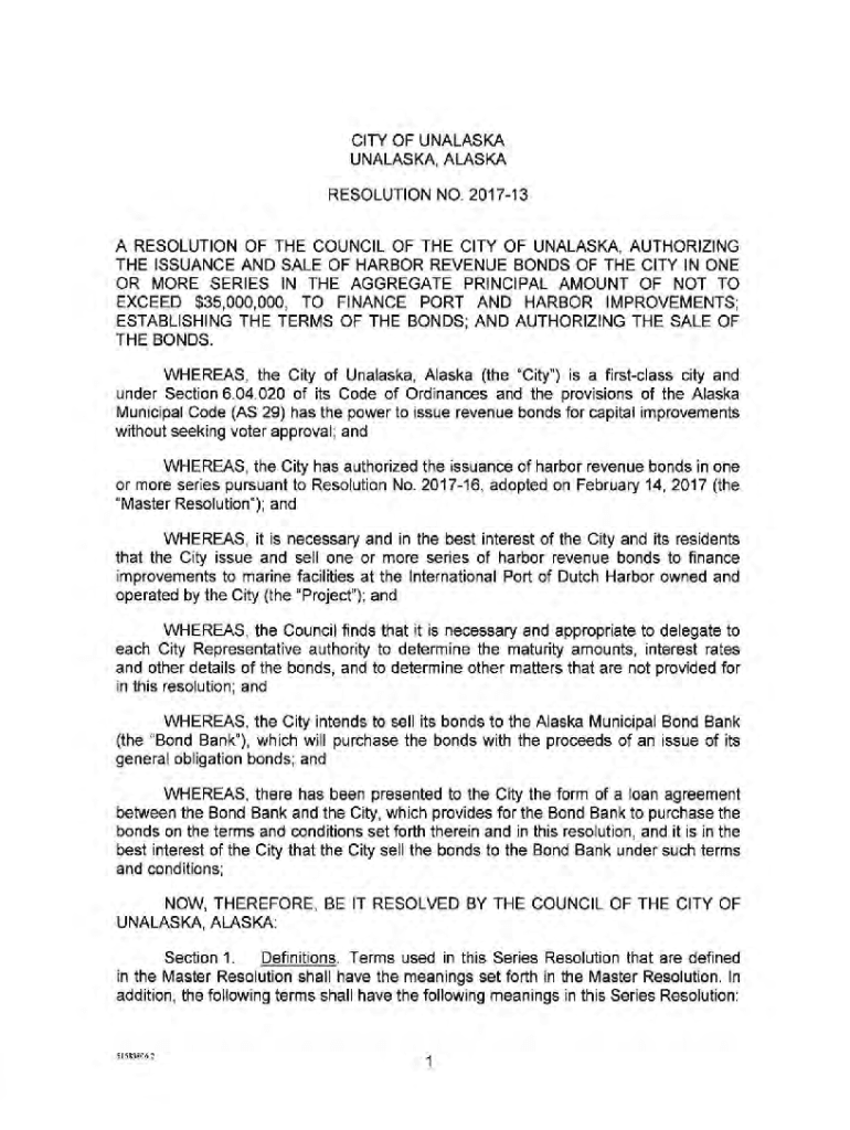 CITY OF UNALASKA UNALASKA, ALASKA RESOLUTION NO. 201713 A RESOLUTION OF THE COUNCIL OF THE CITY OF UNALASKA, AUTHORIZING THE ISSUANCE AND SALE OF HARBOR REVENUE BONDS OF THE CITY IN ONE OR MORE SERIES