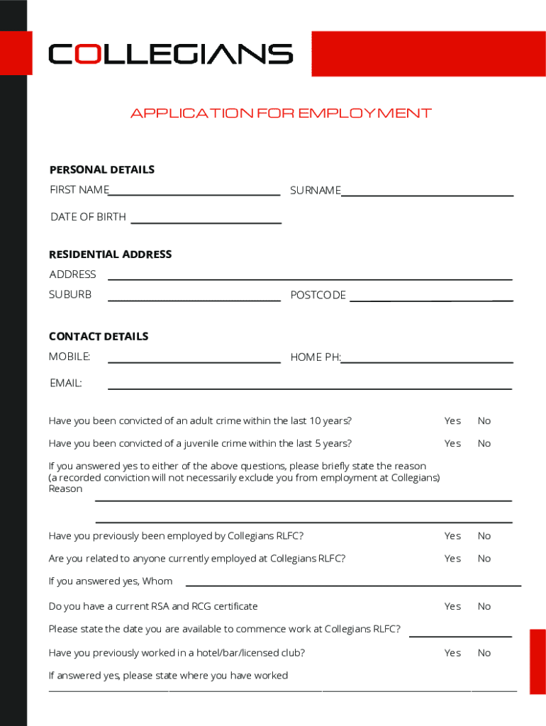 APPLICATION FOR EMPLOYMENTPERSONAL DETAILS FIRST NAMESURNAMEDATE OF BIRTH RESIDENTIAL ADDRESS ADDRESS SUBURBPOSTCODECONTACT DETAILS MOBILE:HOME PH:EMAIL: Have you been convicted of an adult crime