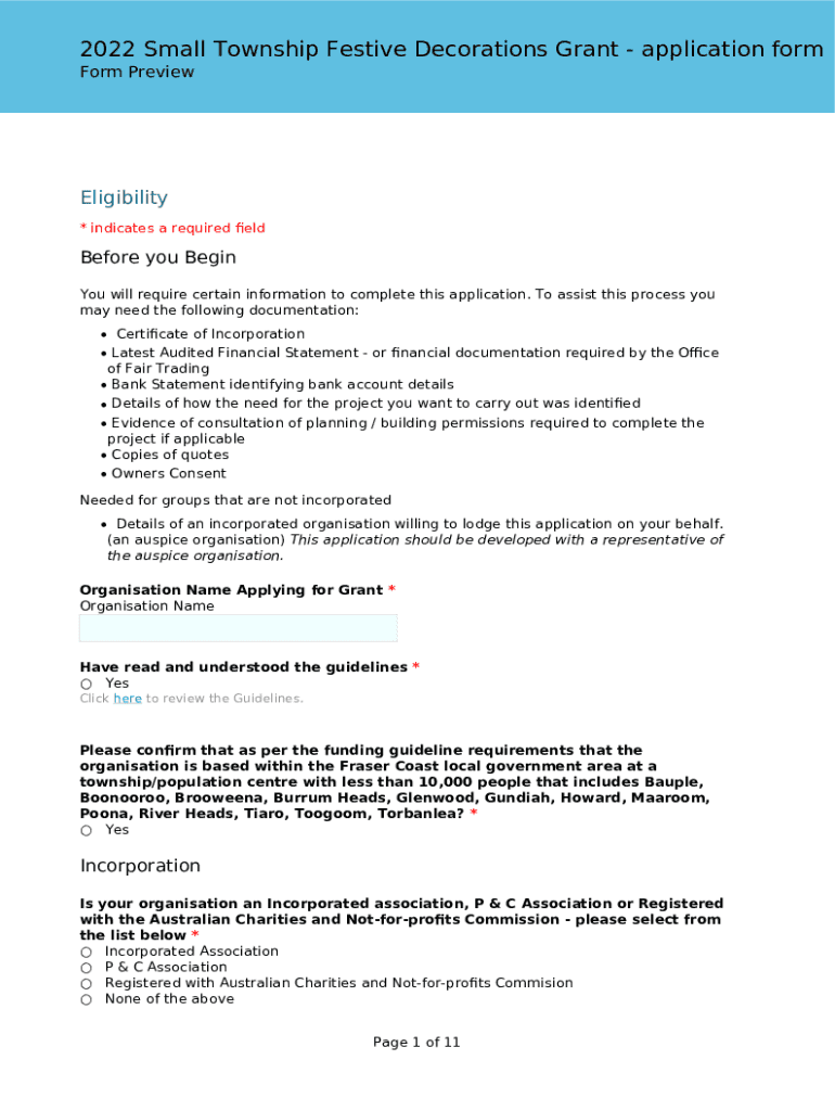 2022 Small Township Festive Decorations Grant application form Form PreviewEligibility * indicates a required eldBefore you Begin You will require certain information to complete this application.