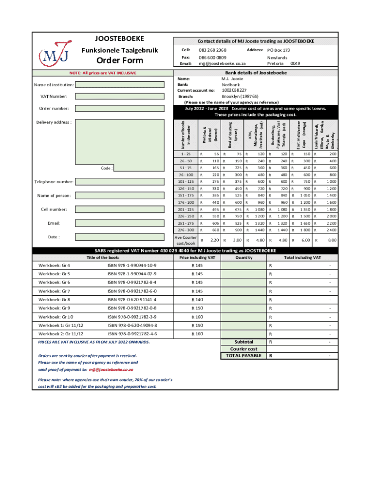JOOSTEBOEKE Funksionele TaalgebruikOrder FormNOTE: All prices are VAT INCLUSIVEName of institution: VAT Number:Contact details of MJ Jooste trading as JOOSTEBOEKE Address: PO Box 173083 268 2368Cell: