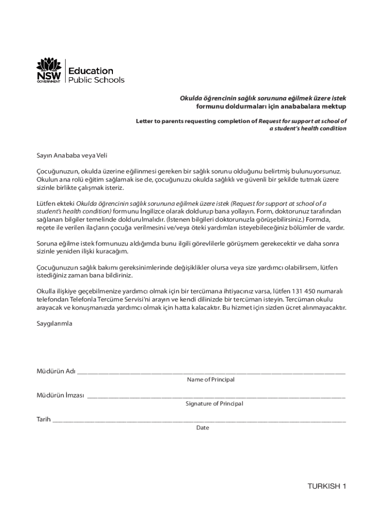 Okulda rencinin salk sorununa eilmek zere istek formunu doldurmalar iin anababalara mektup Letter to parents requesting completion of Request for support at school of a students health conditionSayn