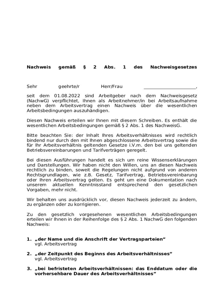 Instructions for the Nachweisgesetz: ber welche Arbeitsbedingungen ... form