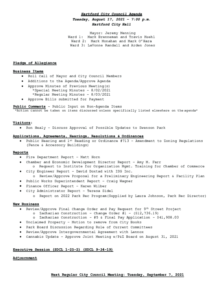 Hartford City Council Agenda Tuesday, August 17, 2021 7:00 p.m. Hartford City Hall Mayor: Jeremy Menning Ward 1: Mark Brenneman and Travis Kuehl Ward 2: Mark Monahan and Mark OHara Ward 3: LaVonne