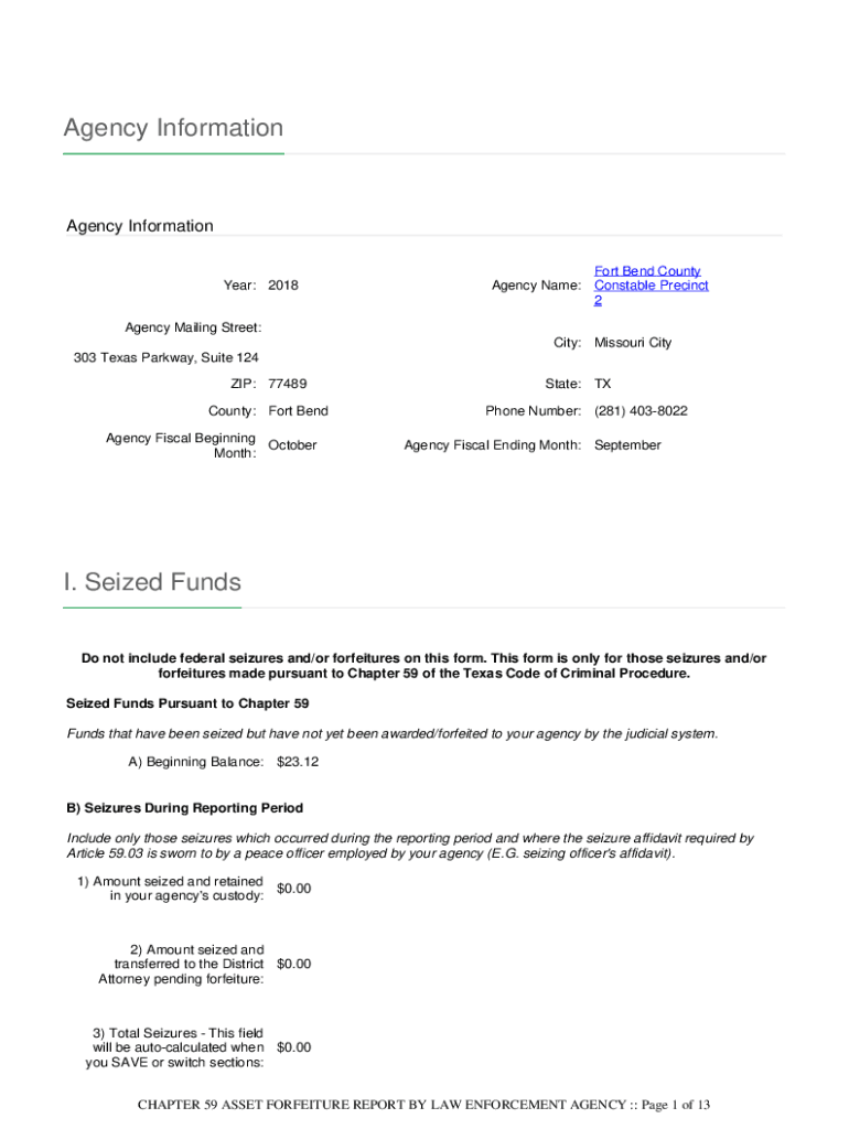 Agency InformationAgency InformationYear: 2018Fort Bend County Agency Name: Constable Precinct 2Agency Mailing Street: City: Missouri City 303 Texas Parkway, Suite 124 ZIP: 77489 County: Fort Bend