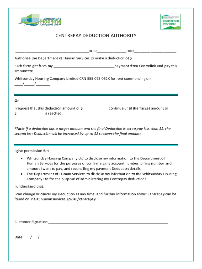CENTREPAY DEDUCTION AUTHORITY I,___DOB:___CRN:___Authorise the Department of Human Services to make a deduction of $___ Each fortnight from my ___payment from Centrelink and pay this amount to: Whitsunday