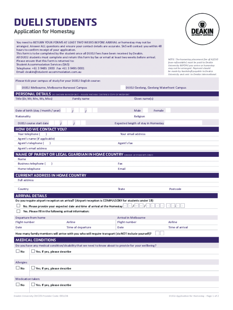 DUELI students Application for HomestayYou need to RETURN YOUR FORMS AT LEAST TWO WEEKS BEFORE ARRIVAL or homestay may not be arranged. Answer ALL questions and ensure your contact details are accurate.