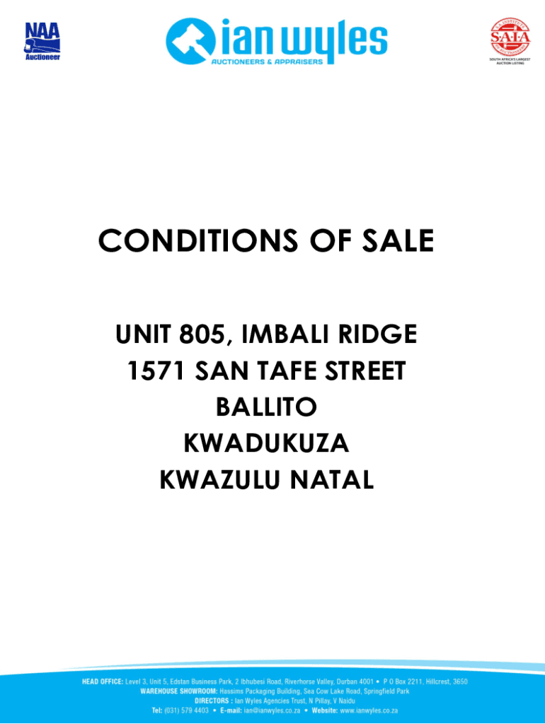 CONDITIONS OF SALE UNIT 805, IMBALI RIDGE 1571 SAN TAFE STREET BALLITO KWADUKUZA KWAZULU NATALBAGGALEY, NORMAN ERNESTCONDITIONS OF SALE ON REGISTRATION In terms of whichIAN WYLES AUCTIONEERSofLevel