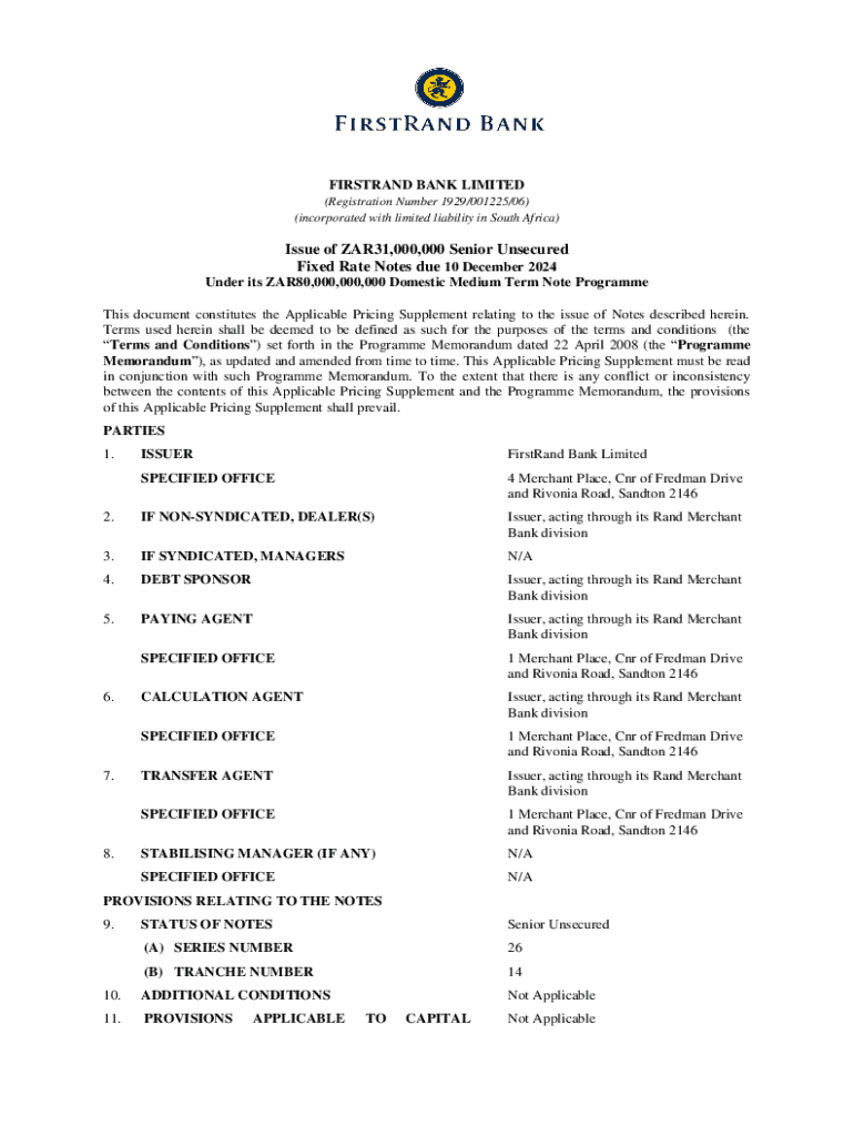 FIRSTRAND BANK LIMITED (Registration Number 1929/001225/06) (incorporated with limited liability in South Africa)Issue of ZAR31,000,000 Senior Unsecured Fixed Rate Notes due 10 December 2024 Under