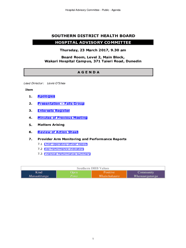 Hospital Advisory Committee Public AgendaSOUTHERN DISTRICT HEALTH BOARD HOSPITAL ADVISORY COMMITTEE Thursday, 23 March 2017, 9.30 am Board Room, Level 2, Main Block, Wakari Hospital Campus, 371 Taieri