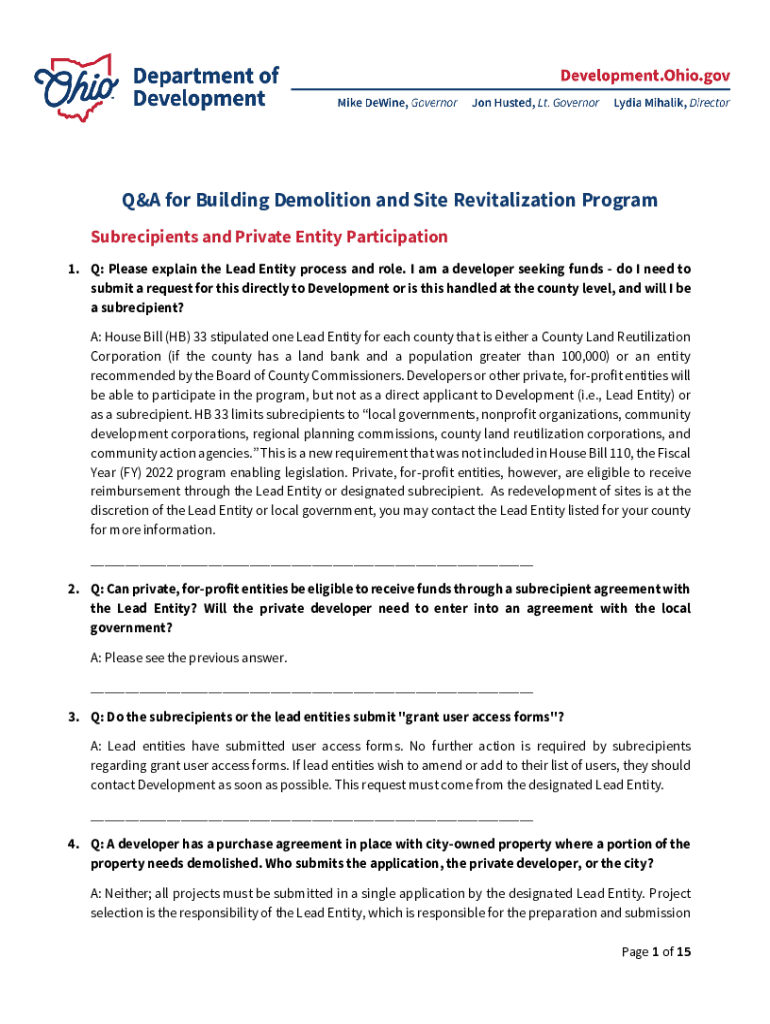 Q&A for Building Demolition and Site Revitalization Program Subrecipients and Private Entity Participation 1. Q: Please explain the Lead Entity process and role. I am a developer seeking funds do