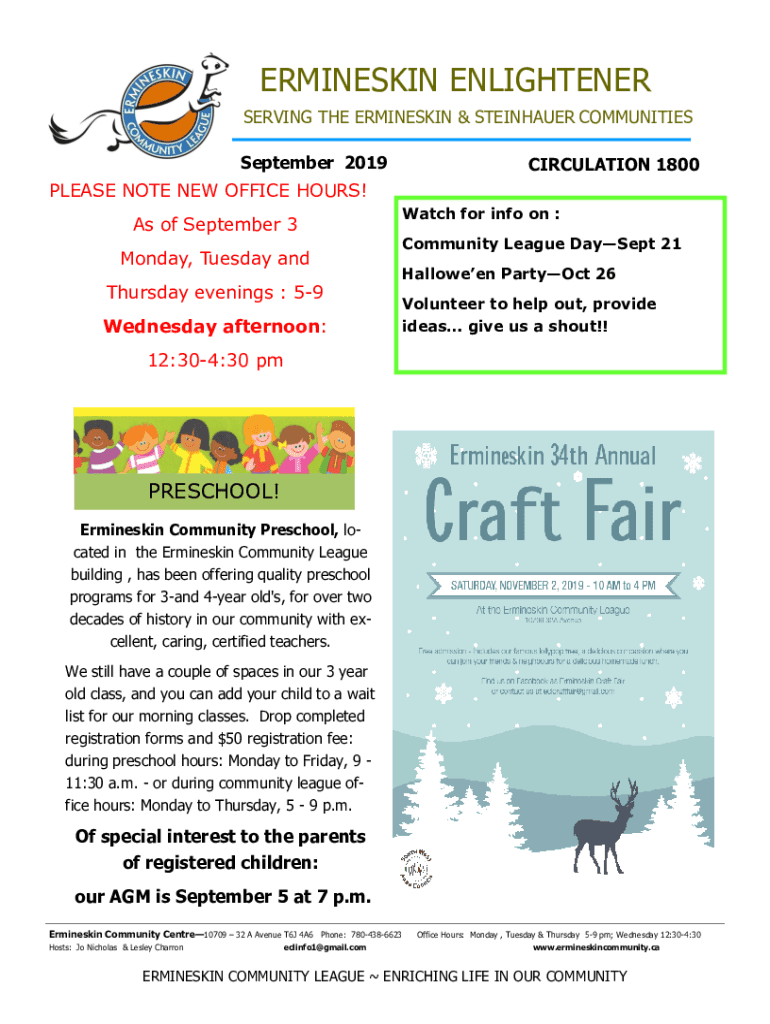 ERMINESKIN ENLIGHTENER SERVING THE ERMINESKIN & STEINHAUER COMMUNITIES September 2019CIRCULATION 1800PLEASE NOTE NEW OFFICE HOURS! As of September 3 Monday, Tuesday and Thursday evenings : 59 Wednesday