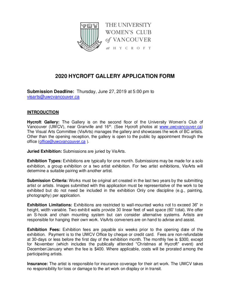 2020 HYCROFT GALLERY APPLICATION FORM Submission Deadline: Thursday, June 27, 2019 at 5:00 pm to visarts@uwcvancouver.ca INTRODUCTION Hycroft Gallery: The Gallery is on the second floor of the University