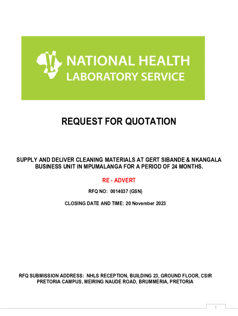 REQUEST FOR QUOTATIONSUPPLY AND DELIVER CLEANING MATERIALS AT GERT SIBANDE & NKANGALA BUSINESS UNIT IN MPUMALANGA FOR A PERIOD OF 24 MONTHS. RE ADVERT RFQ NO: 0014037 (GSN) CLOSING DATE AND TIME: