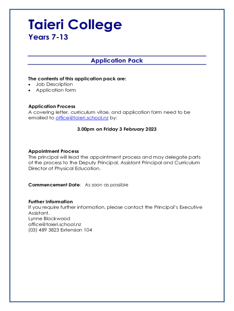 Taieri College Years 713 Application Pack The contents of this application pack are: Job Description Application form Application Process A covering letter, curriculum vitae, and application form
