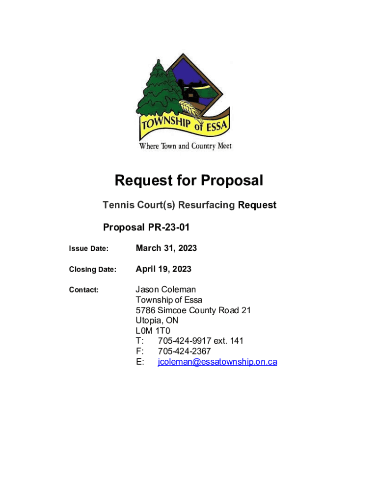 Request for Proposal Tennis Court(s) Resurfacing Request Proposal PR2301 Issue Date:March 31, 2023Closing Date:April 19, 2023Contact:Jason Coleman Township of Essa 5786 Simcoe County Road 21 Utopia,