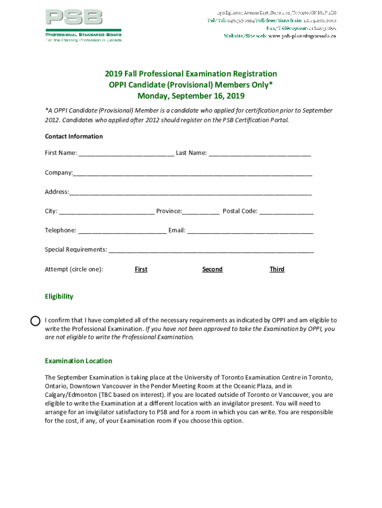 2019 Fall Professional Examination Registration OPPI Candidate (Provisional) Members Only* Monday, September 16, 2019 *A OPPI Candidate (Provisional) Member is a candidate who applied for certification