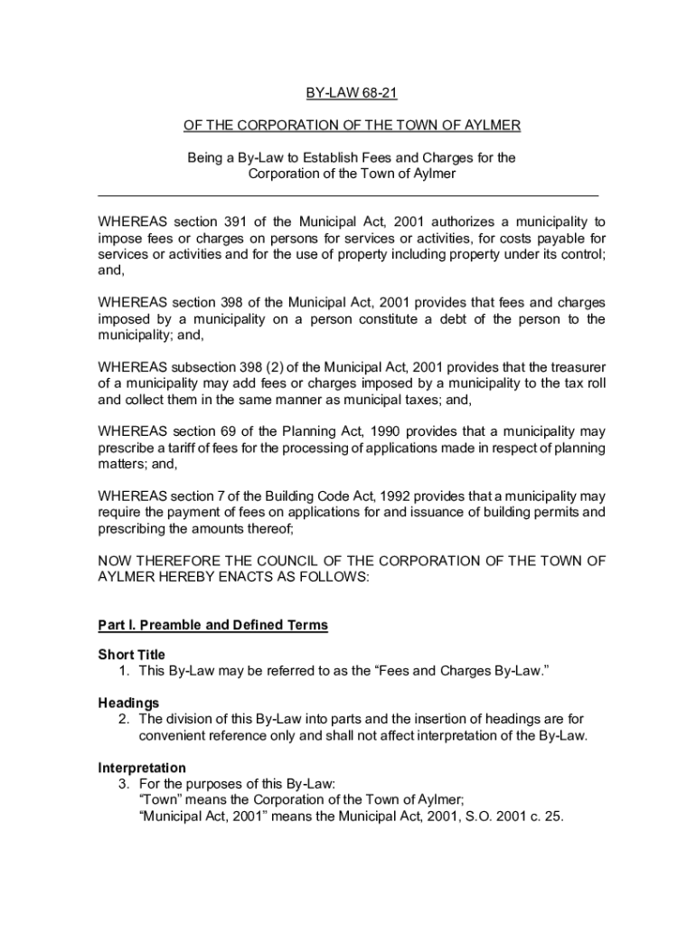 BYLAW 6821 OF THE CORPORATION OF THE TOWN OF AYLMER Being a ByLaw to Establish Fees and Charges for the Corporation of the Town of Aylmer ___ WHEREAS section 391 of the Municipal Act, 2001 authorizes