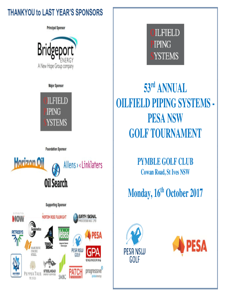THANKYOU to LAST YEARS SPONSORS53rd ANNUAL OILFIELD PIPING SYSTEMS PESA NSW GOLF TOURNAMENT PYMBLE GOLF CLUB Cowan Road, St Ives NSWMonday, 16th October 2017OILMEN OF NSW GOLF COMMITTEE Cameron Fink