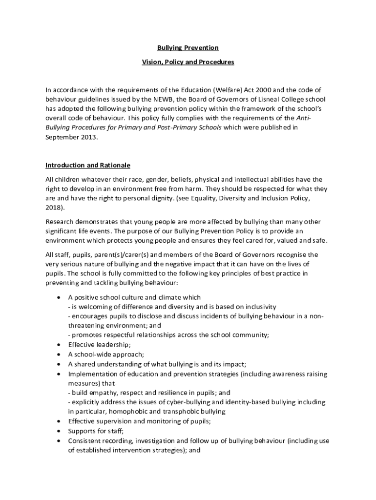 Bullying Prevention Vision, Policy and ProceduresIn accordance with the requirements of the Education (Welfare) Act 2000 and the code of behaviour guidelines issued by the NEWB, the Board of Governors