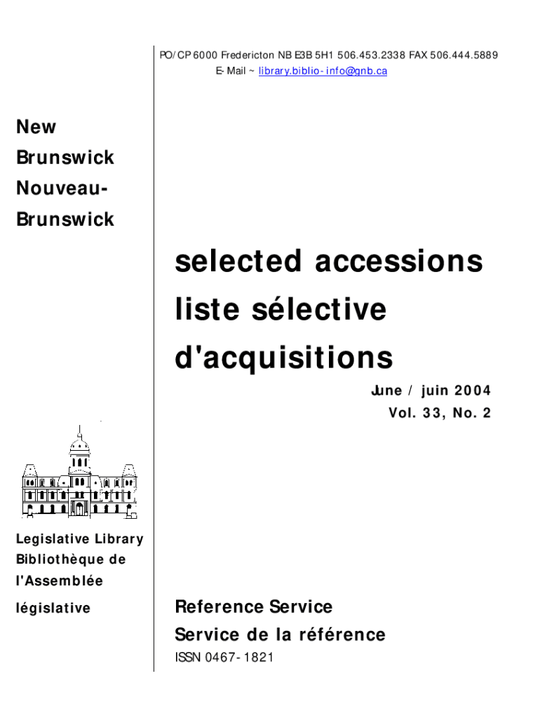 PO/CP 6000 Fredericton NB E3B 5H1 506.453.2338 FAX 506.444.5889 EMail library.biblioinfo@gnb.caNew Brunswick NouveauBrunswickselected accessionsliste slectived\'acquisitionsJune / juin 2004 Vol. 33,
