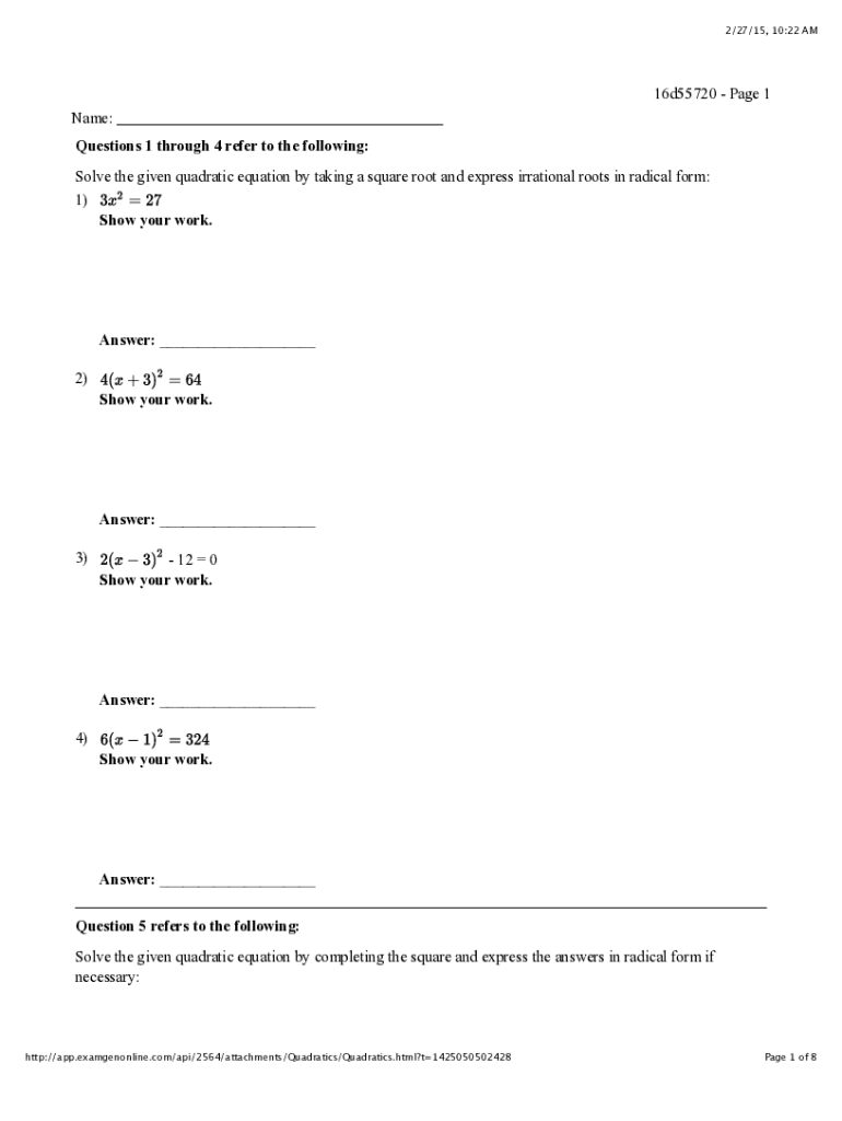 2/27/15, 10:22 AM16d55720 Page 1 Name: Questions 1 through 4 refer to the following: Solve the given quadratic equation by taking a square root and express irrational roots in radical form: 1) Show