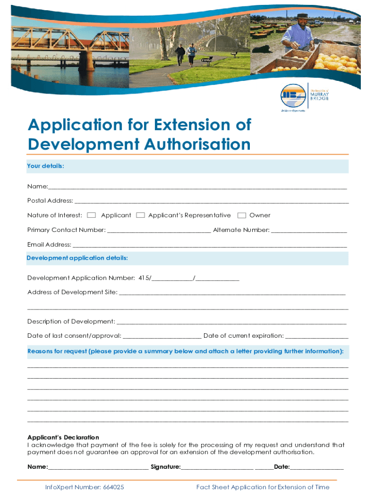 Application for Extension of Development Authorisation Your details: Name:___ Postal Address: ___ Nature of Interest:ApplicantApplicants RepresentativeOwnerPrimary Contact Number: ___ Alternate Number:
