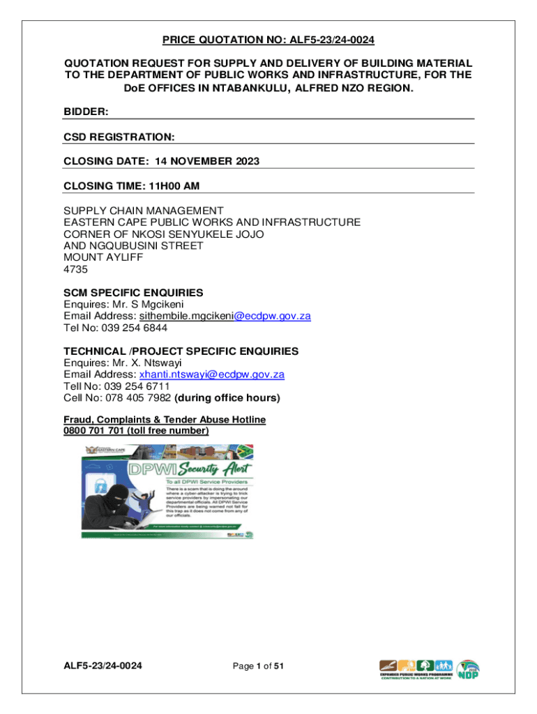 PRICE QUOTATION NO: ALF523/240024 QUOTATION REQUEST FOR SUPPLY AND DELIVERY OF BUILDING MATERIAL TO THE DEPARTMENT OF PUBLIC WORKS AND INFRASTRUCTURE, FOR THE DoE OFFICES IN NTABANKULU, ALFRED NZO
