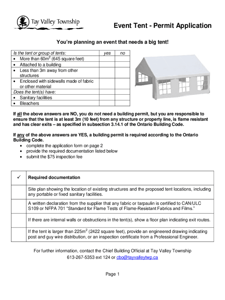 Event Tent Permit Application Youre planning an event that needs a big tent! Is the tent or group of tents: More than 60m2 (645 square feet) Attached to a building Less than 3m away from other structures
