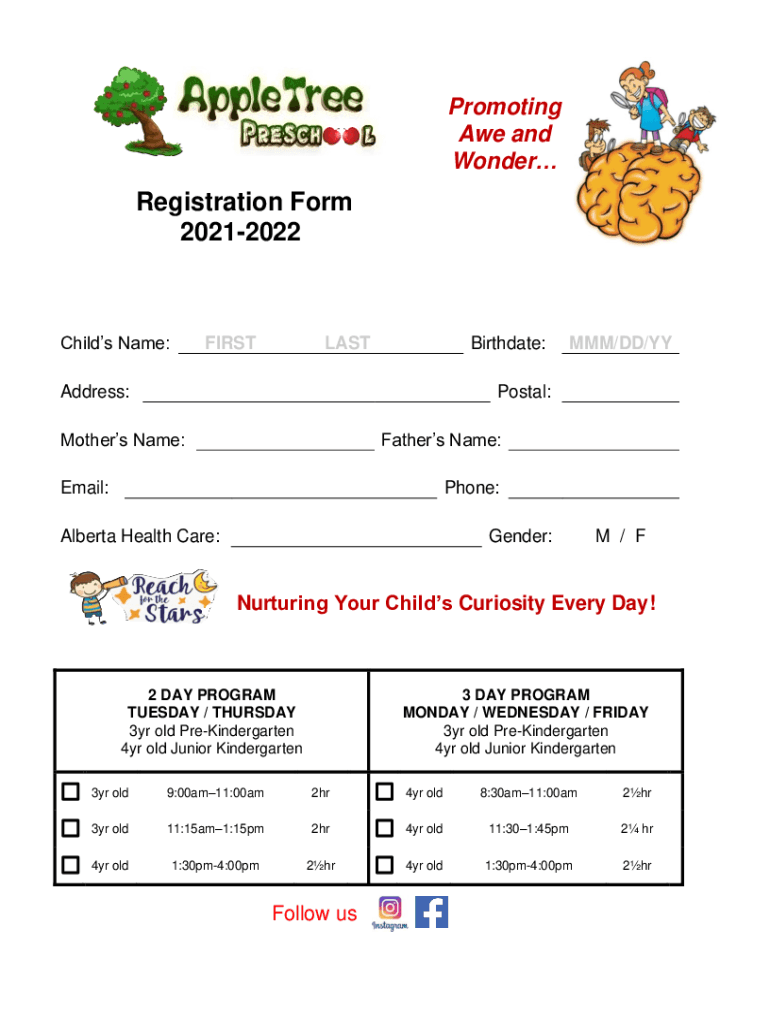 Get the free Registration Form 2021-2022 - Apple Tree Preschool