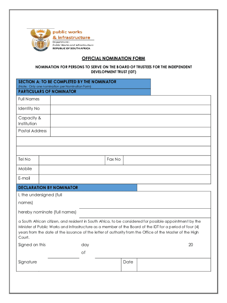 OFFICIAL NOMINATION FORM NOMINATION FOR PERSONS TO SERVE ON THE BOARD OF TRUSTEES FOR THE INDEPENDENT DEVELOPMENT TRUST (IDT)SECTION A: TO BE COMPLETED BY THE NOMINATOR (Note: Only one nomination