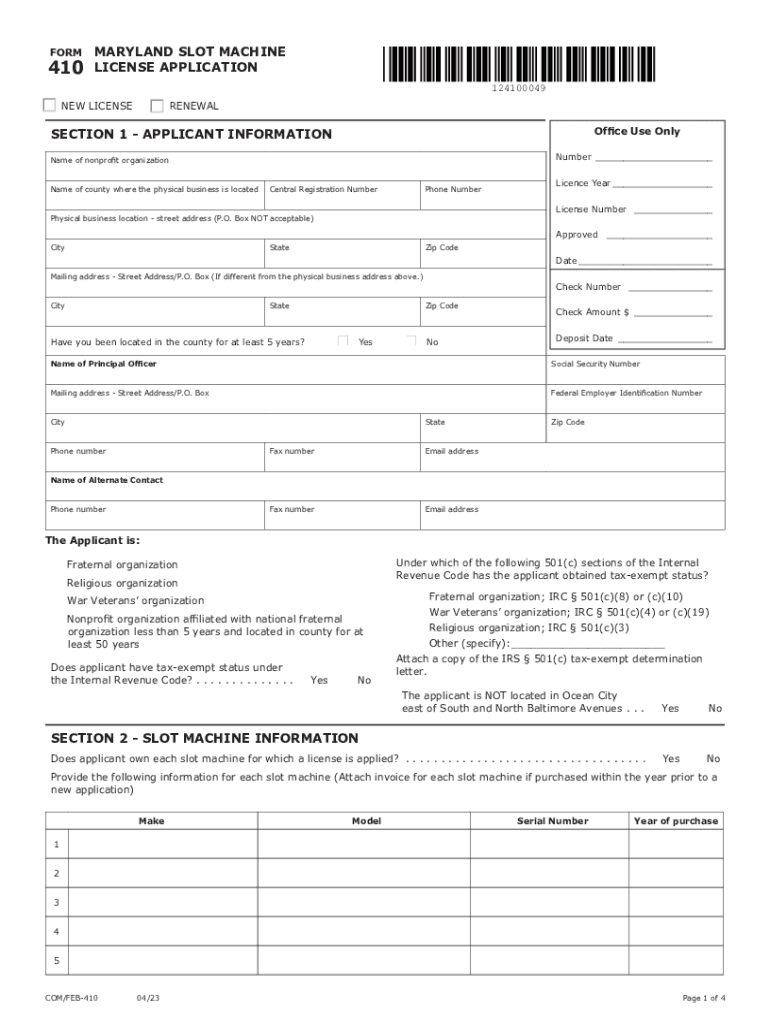 FORM410MARYLAND SLOT MACHINE LICENSE APPLICATION 124100049NEW LICENSERENEWAL Office Use OnlySECTION 1 APPLICANT INFORMATIONNumber___Name of nonprofit organizationName of county where the physical